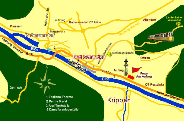 Anfahrt von Dresden über die A17 bis Abfahrt Pirna - Bad Schandau. Sie fahren in Richtung Pirna und kommen direkt auf die B172. Weiter auf der B172 über Königstein bis Bad Schandau Zentrum .Nach dem Marktplatz biegt die Hauptstraße rechts ab in Richtung Schmilka - Grenzübergang. Sie fahren bis zum Aufzug auf der linken Seite und sind an unserer Ferienwohnung. | |||||||||||||||||||||||||